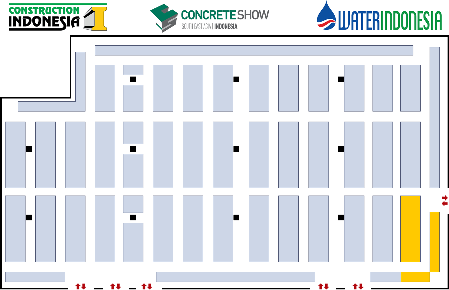 The booths coloured in yellow are highlighting the location of the Europe, America and Australia/NZ Pavilions for Water Indonesia.